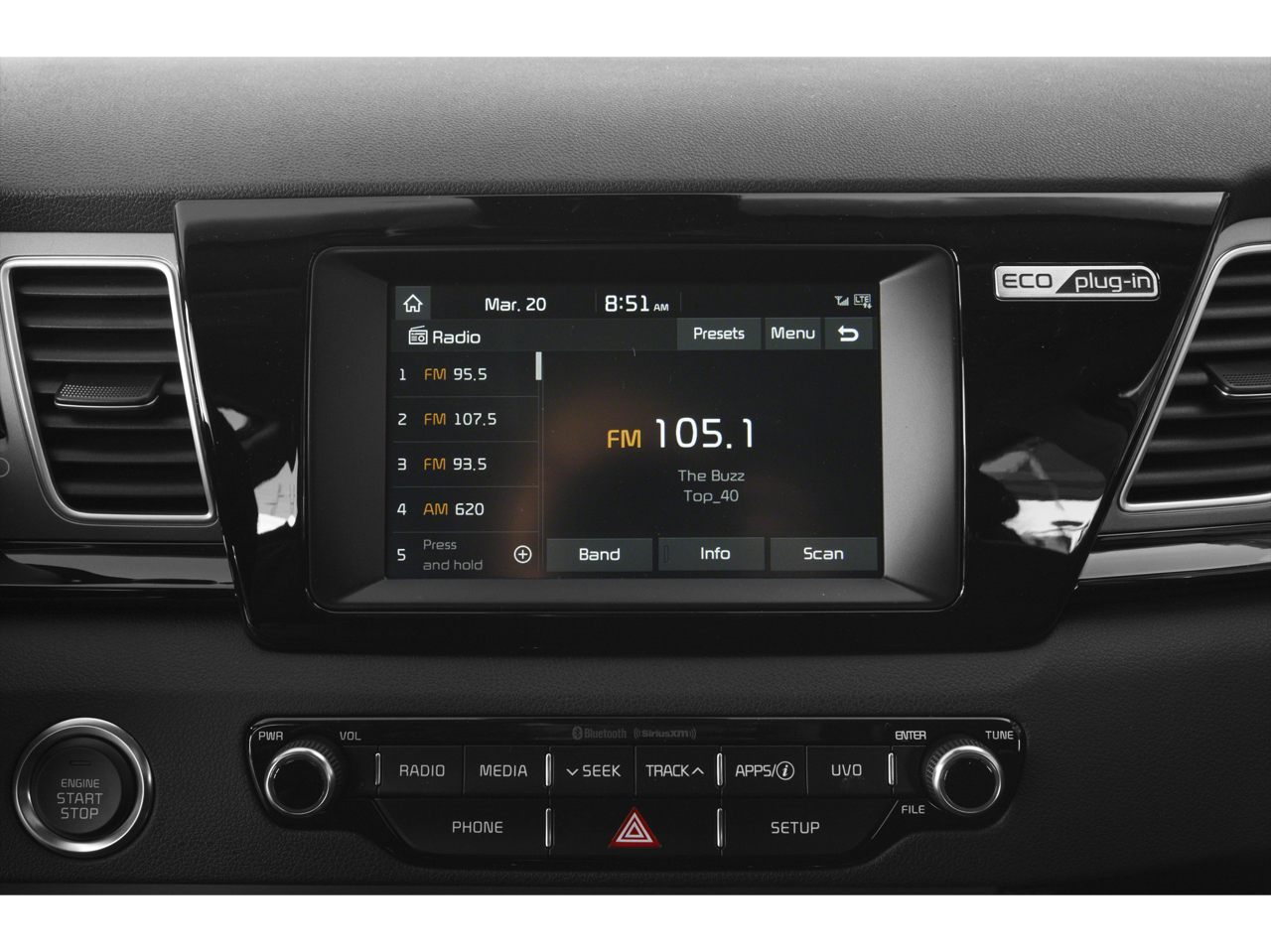 - Radio: AM/FM/MP3/SiriusXM Satellite -inc: 6 speakers, Bluetooth® wireless technology w/steering-wheel-mounted controls, 7" touchscreen w/UVO eco infotainment and support for Android Auto and Apple CarPlay, USB, auxiliary input jacks and USB charger outlet