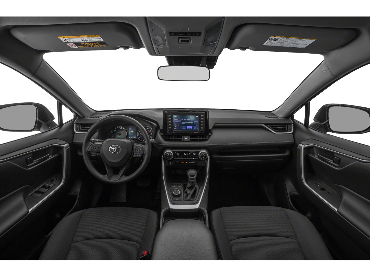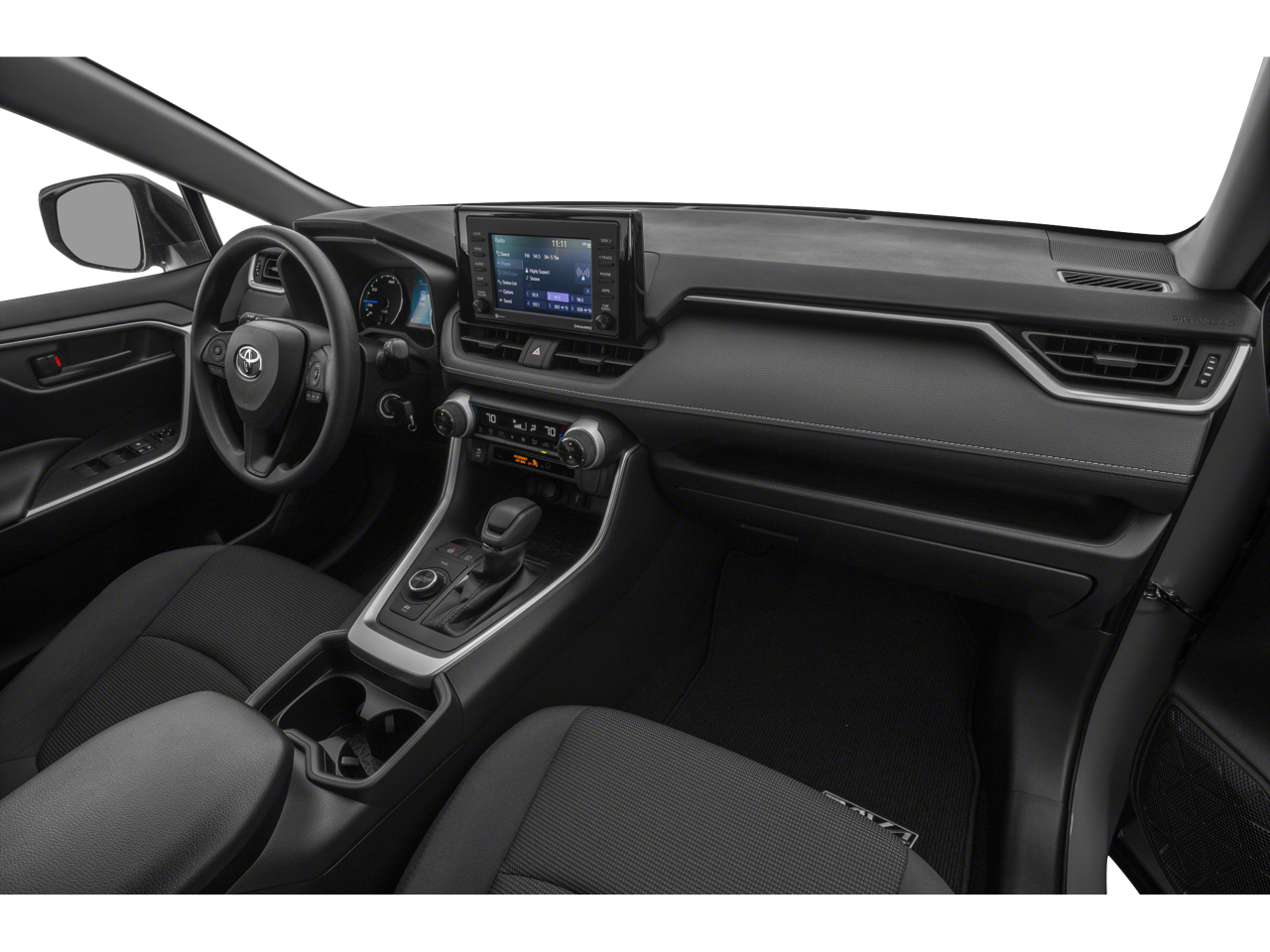 Vaden is pleased to offer this Midnight Black Metallic 2019 Toyota RAV4 Hybrid LE with Black Cloth... Beautifully equipped with Carpet Mat Package (Carpet Cargo Mat and Carpet Floor Mats), 2.5L 4-Cylinder, 4-Wheel Disc Brakes, 6 Speakers, ABS brakes, Air Conditioning, Alloy wheels, AM/FM radio, Apple CarPlay, Auto High-beam Headlights, Automatic temperature control, Axle Ratio: TBD, Brake assist, Bumpers: body-color, Driver door bin, Driver vanity mirror, Dual front impact airbags, Dual front side impact airbags, Electronic Stability Control, Emergency communication system: Safety Connect, Exterior Parking Camera Rear, Fabric Seat Trim, Four wheel independent suspension, Front anti-roll bar, Front Bucket Seats, Front Center Armrest, Front dual zone A/C, Front reading lights, Front Sport Seats, Illuminated entry, Knee airbag, Low tire pressure warning, Occupant sensing airbag, Outside temperature display, Overhead airbag, Overhead console, Panic alarm, Passenger door bin, Passenger vanity mirror, Power door mirrors, Power steering, Power windows, Radio data system, Radio: Entune Audio w/App Suite, Rear anti-roll bar, Rear seat center armrest, Rear window defroster, Rear window wiper, Remote keyless entry, Roof rack: rails only, Speed control, Speed-sensing steering, Split folding rear seat, Spoiler, Steering wheel mounted audio controls, Telescoping steering wheel, Tilt steering wheel, Traction control, Trip computer, and Wheels: 17" x 7.0J Silver Aluminum Alloy! Approved customer communicated additions (repairing minor cosmetic flaw, added accessories, etc.) Prior to delivery will be subject to additional charges. ***All of Our Vaden New Car Pricing is Transparent, the price you see is the price you pay!!**** POWER PACKAGE, 2.5L 4-Cylinder.