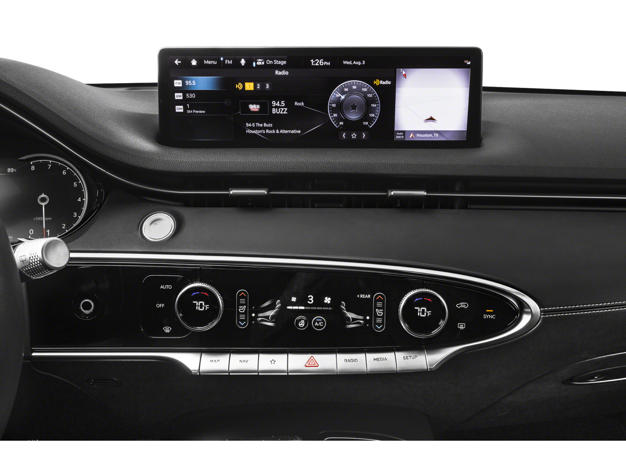 - Radio: AM/FM/SiriusXM/HD Premium Audio System -inc: navigation system, 9 speakers, internal amplifier, 14.5" HD display screen, Apple CarPlay and Android Auto, Bluetooth® hands-free phone system w/audio streaming, USB ports and Genesis Connected Services