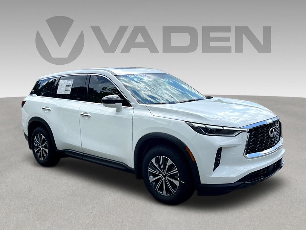Vaden is pleased to offer 2025 INFINITI QX60 PURE in Glacier White, Beautifully equipped with all the essentials and then some! 3rd row seats: bench, 4-Wheel Disc Brakes, 9 Speakers, ABS brakes, Air Conditioning, Alloy wheels, AM/FM radio: SiriusXM, Anti-whiplash front head restraints, Apple CarPlay/Android Auto, Auto High-beam Headlights, Auto-dimming Rear-View mirror, Automatic temperature control, Blind Spot Warning, Brake assist, Bumpers: body-color, Delay-off headlights, Driver door bin, Driver vanity mirror, Dual front impact airbags, Dual front side impact airbags, Electronic Stability Control, Emergency communication system: INFINITI InTouch, Floor Mats w/Bench Seats on 3rd Row Tray, Four wheel independent suspension, Front anti-roll bar, Front Bucket Seats, Front Center Armrest, Front dual zone A/C, Front reading lights, Fully automatic headlights, Heated door mirrors, Heated Front Bucket Seats, Heated front seats, Heated steering wheel, Illuminated entry, Knee airbag, Leather Shift Knob, Leather steering wheel, Leather-Appointed Seating Surfaces, Literature Kit, Low tire pressure warning, Memory seat, Occupant sensing airbag, Outside temperature display, Overhead airbag, Overhead console, Panic alarm, Passenger door bin, Passenger vanity mirror, Power door mirrors, Power driver seat, Power Liftgate, Power moonroof, Power passenger seat, Power steering, Power windows, Radio data system, Radio: AM/FM Audio System, Rain sensing wipers, Rear air conditioning, Rear anti-roll bar, Rear Parking Sensors, Rear reading lights, Rear seat center armrest, Rear side impact airbag, Rear window defroster, Rear window wiper, Reclining 3rd row seat, Remote keyless entry, Security system, Speed control, Speed-sensing steering, Speed-Sensitive Wipers, Splash Guards, Split folding rear seat, Spoiler, Steering wheel mounted audio controls, Tachometer, Telescoping steering wheel, Tilt steering wheel, Traction control, Trip computer, Turn signal indicator mirrors, Variably intermittent wipers, and Wheels: 18 x 8J Machined Aluminum Alloy.